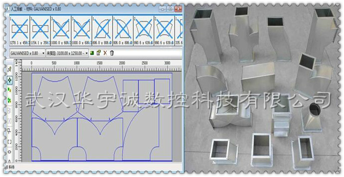加工范圍:0.2-6.0mm任意材料鋼板的切割成型!可切割各種異形件,電腦直接畫(huà)圖,導(dǎo)出加工程序,批量高速切割,效果好,精度高,不掛渣!配合專(zhuān)用的風(fēng)管展開(kāi)軟件,自動(dòng)生成圖紙、導(dǎo)出加工程序。操作人員所需要做的就是在軟件中選擇所需要的風(fēng)管樣式,輸入所需要的尺寸,然后調(diào)出加工程序進(jìn)行切割就可以了。既方便快捷、又精確實(shí)用。